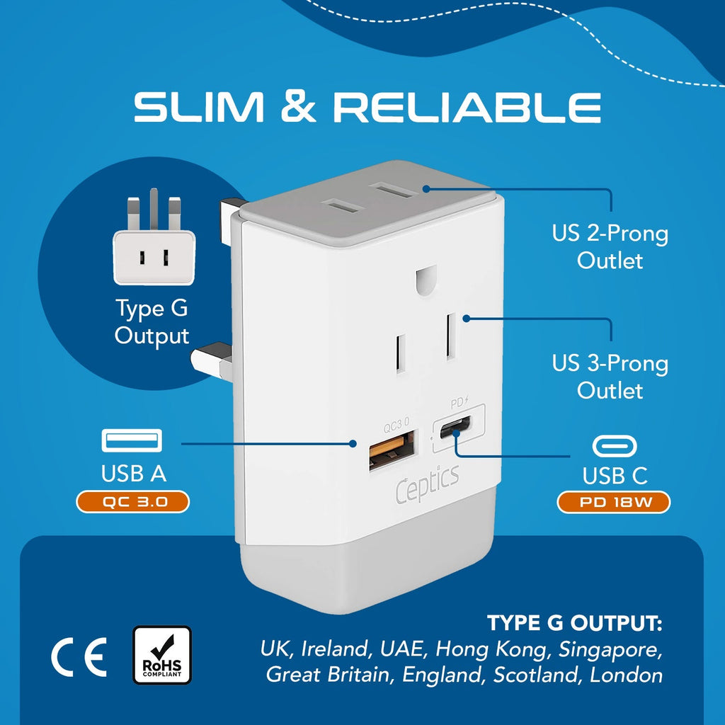 UK, Hong Kong, Travel Plug Adapter | Type G - USB-C Ports + 2 US Outlets (PAK-30W-7)