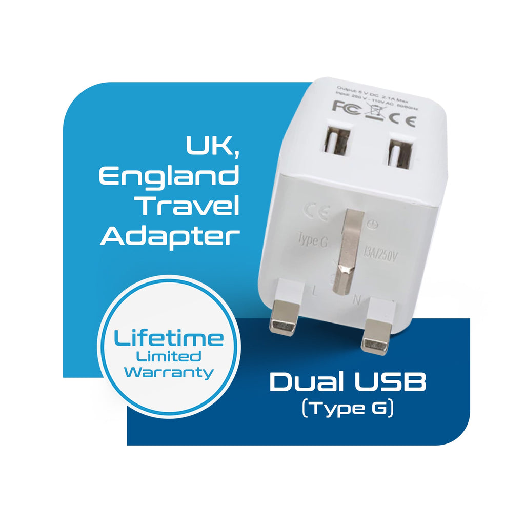 UK, England Travel Adapter Plug with Dual USB - Type G - 2 Pack (CTU-7)